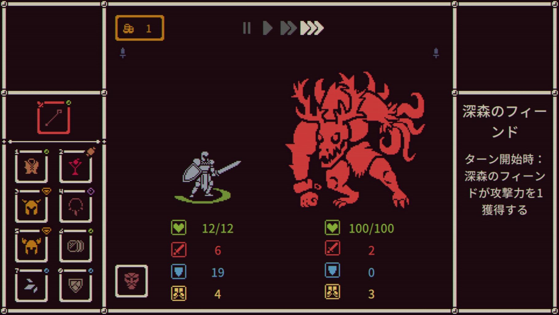 道中で見つかるアイテムにはステータス値を上げるだけでない様々な特性が用意されており、そのユニークさをどのように活かすか考えるのがプレイしていて面白いところです。とくに「ターン開始時」や「被ダメ時」など、効果の発動タイミングにフォーカスする特性が多く用意されており、オートバトルながら「段取り」を強く意識したビルドの構築は新鮮でした。
