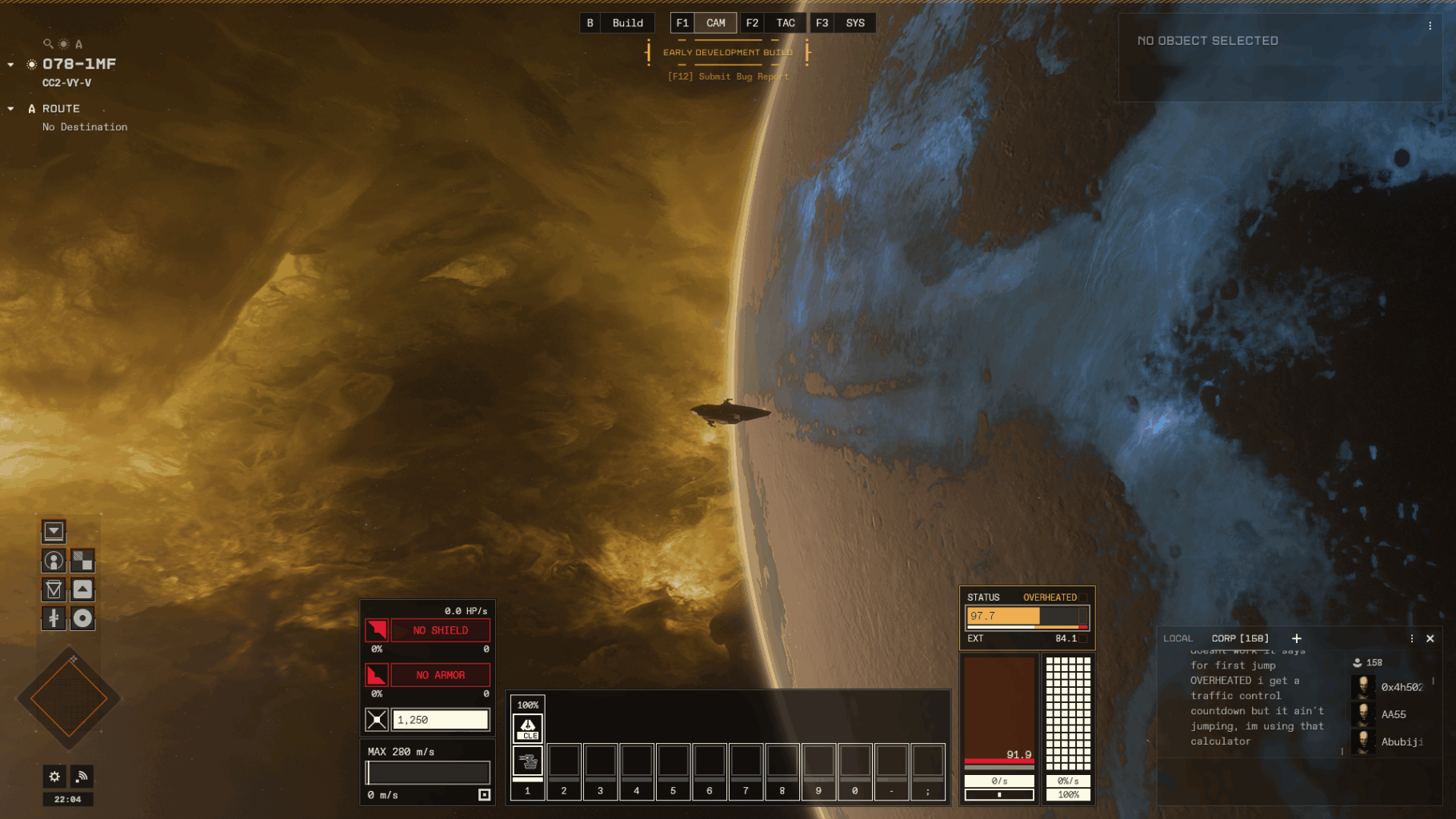鉱石の製錬→アイテムの製造→船の建造まで進めればチュートリアルも終盤。「Reflex」というコルベットに乗り換え、各部位にパーツを装備させれば旅立ちの時です。適当な太陽系にジャンプしましょう。ですがその前にたっぷりの燃料を忘れずに。ジャンプは燃料を相当消費します。私はタンク三分の一くらいしか入れず、ノープランで出発したらジャンプ先でほぼ燃料尽きて詰みましたw それとオーバーヒートにも注意。過度なジャンプや太陽に近い位置にいると機体が高温になり運動性能が低下してしまいます。